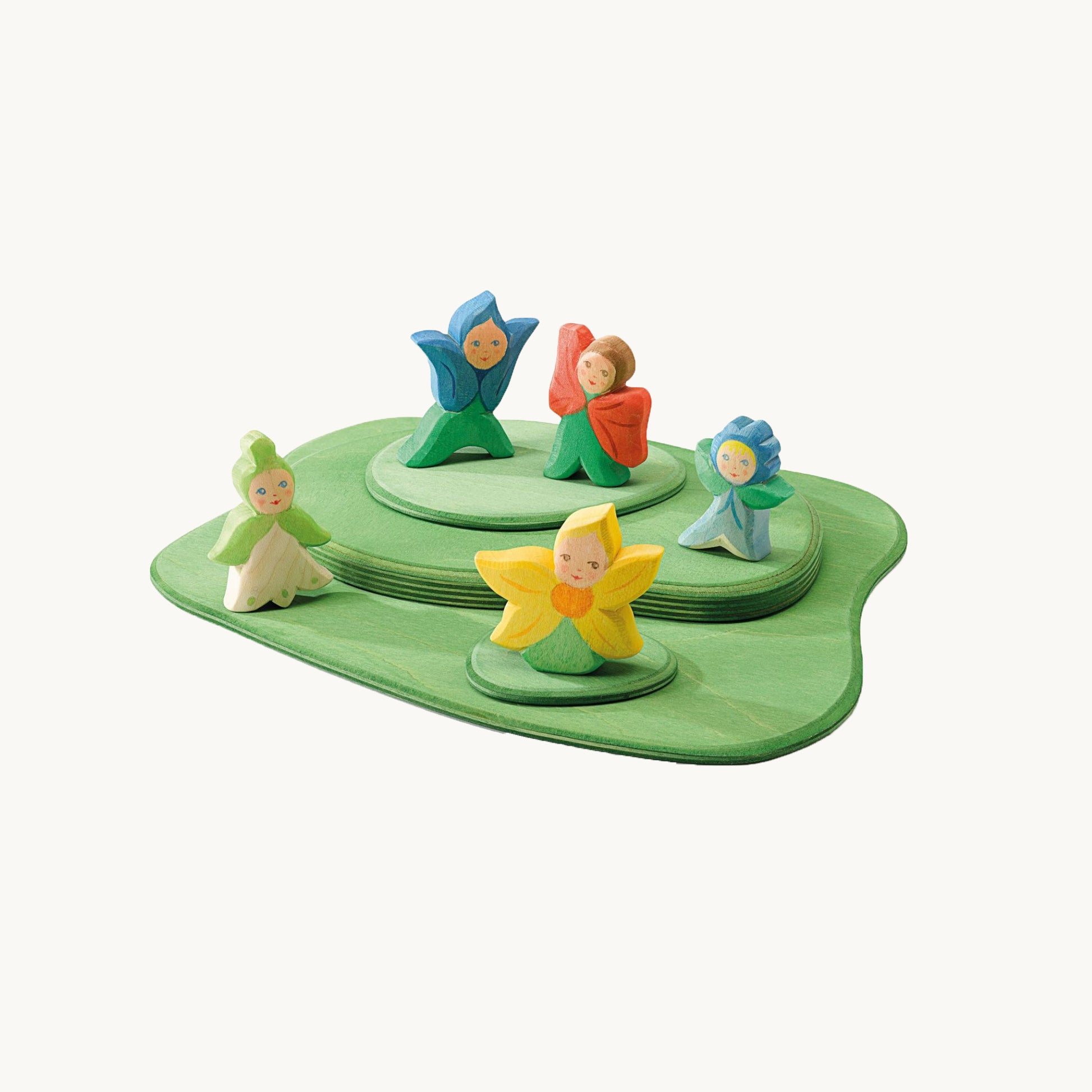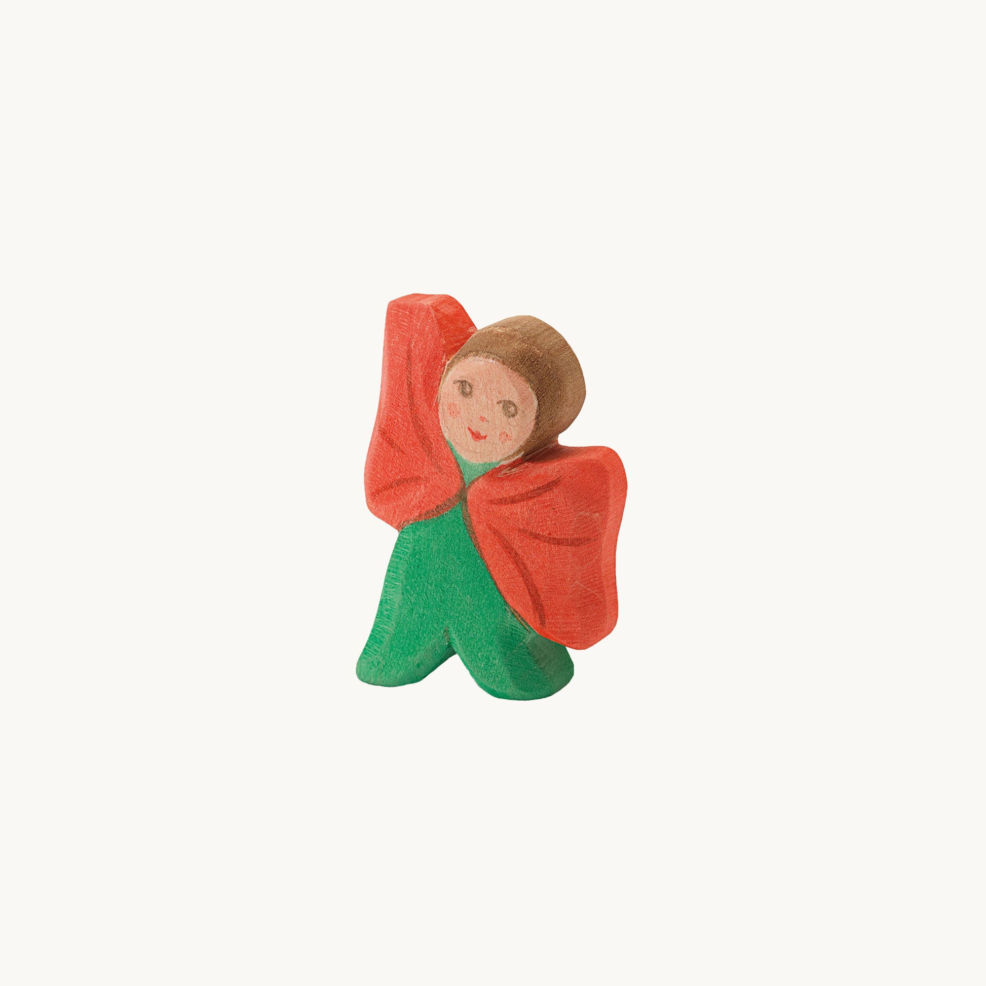 Et lille blomsterbarn med en rød valmue som krone – livligt, blødt og fuld af sommerstemning. Figuren er håndskåret i ahorntræ, malet i hånden og behandlet med plantebaseret, giftfri farve, så træets naturlige glød stadig træder frem.