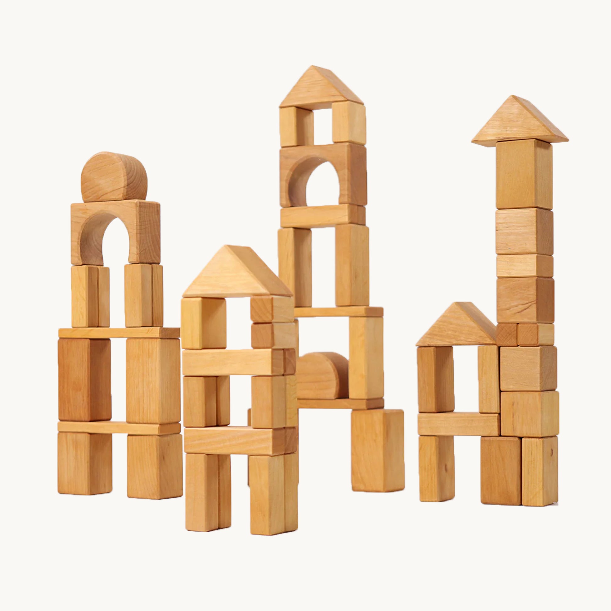 De naturlige træklodser har en varm overflade og tydelig årestruktur, som gør hver del unik. Et tidløst sæt, der inspirerer til både leg, konstruktion og rolig fordybelse.