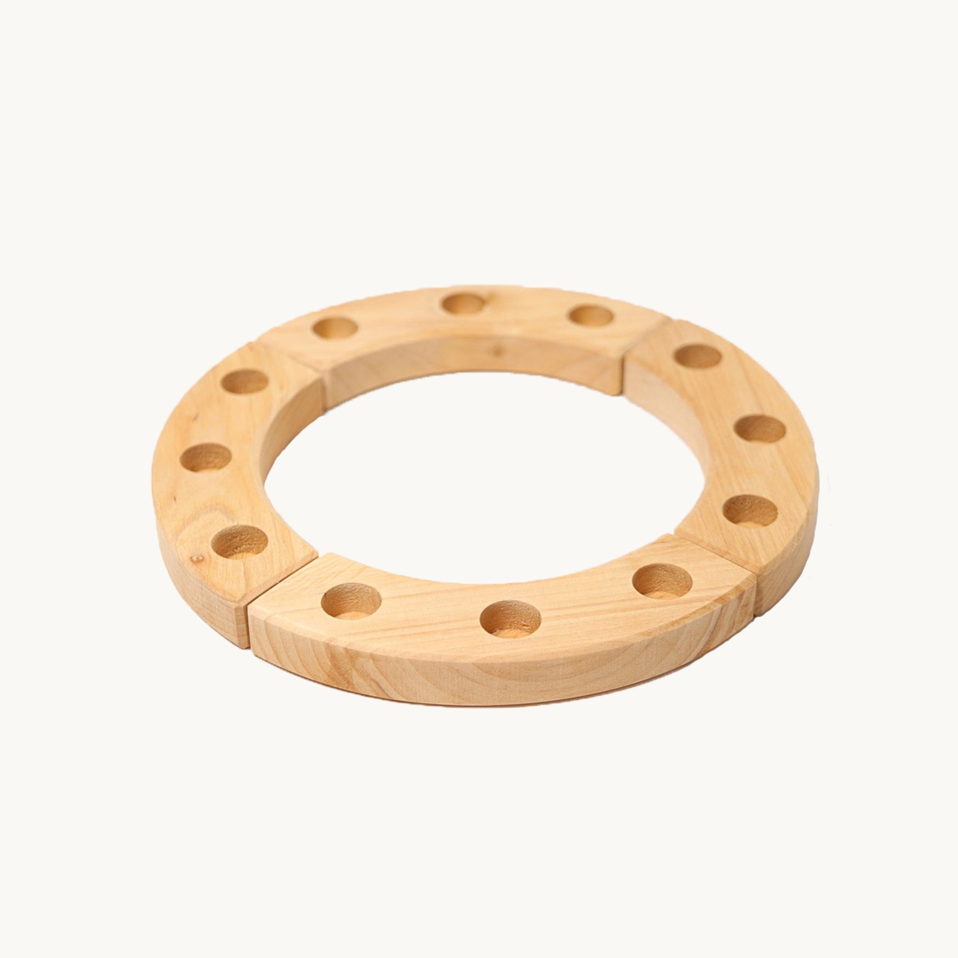 Ringen består af fire buede trædele, som tilsammen danner en cirkel med 12 huller – én til hver måned, eller til lys, tal, figurer og symboler, som I vælger at sætte ind. Brug den på middagsbordet, i vindueskarmen eller som en del af en årstidsopstilling. Kombinationerne er uendelige, og I kan tilpasse den år efter år, barn efter barn.