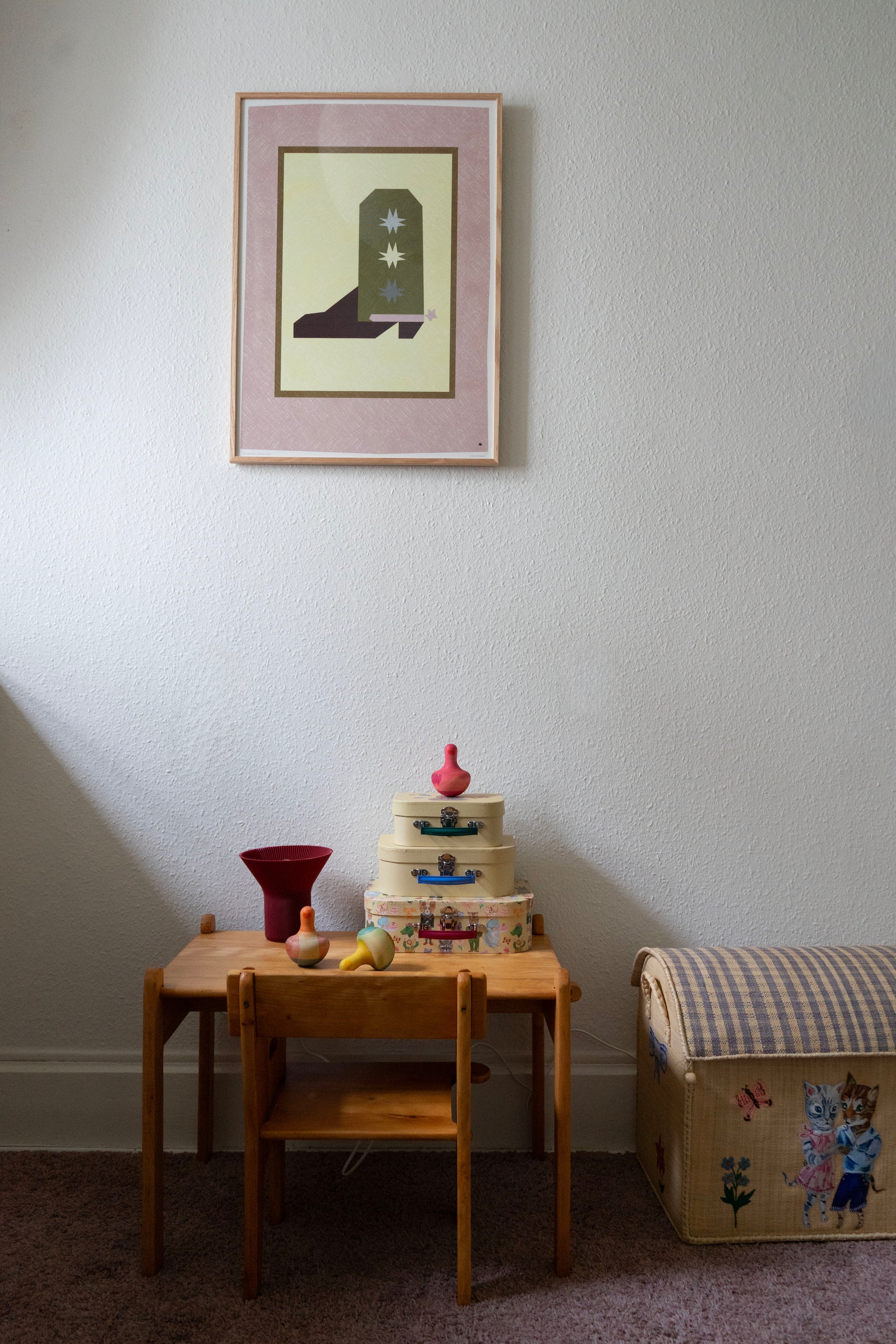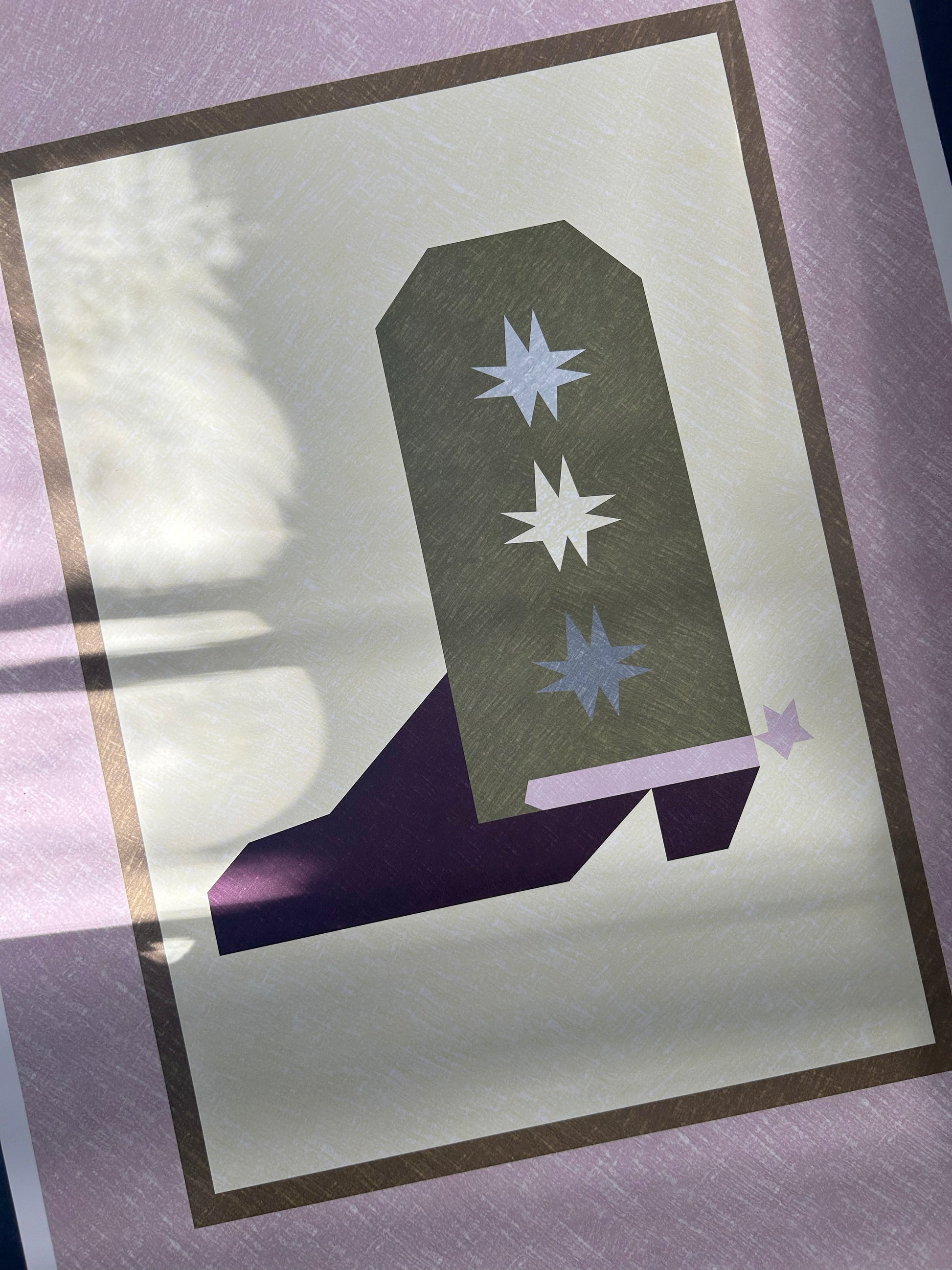 Inspireret af vintage børnequilts fra det amerikanske Midtvesten, har motivet en nostalgisk charme og et grafisk, håndtegnet udtryk, der kombinerer barnets verden med voksen æstetik. Støvlen er bygget op som en farverig collage, hvor hvert udklip er farvelagt med oliekridt, hvilket giver dybde og struktur - Et grafisk statement med en legende tilgang.