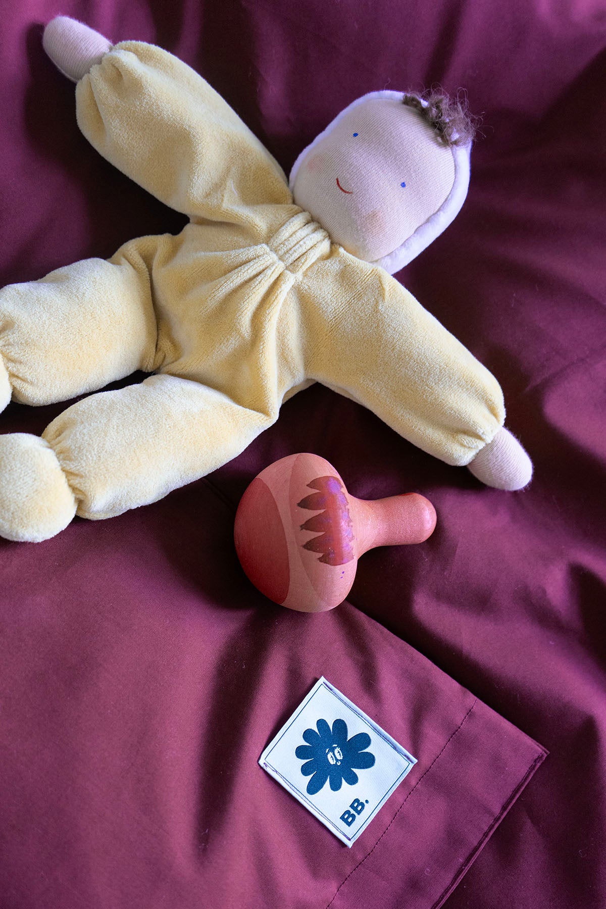 Materialet består af niki (velour) og bomuld, fyldt med polyesteruld. Stoffet er OEKO-TEX® STANDARD 100-certificeret, så det er sikkert og skånsomt mod barnets hud.