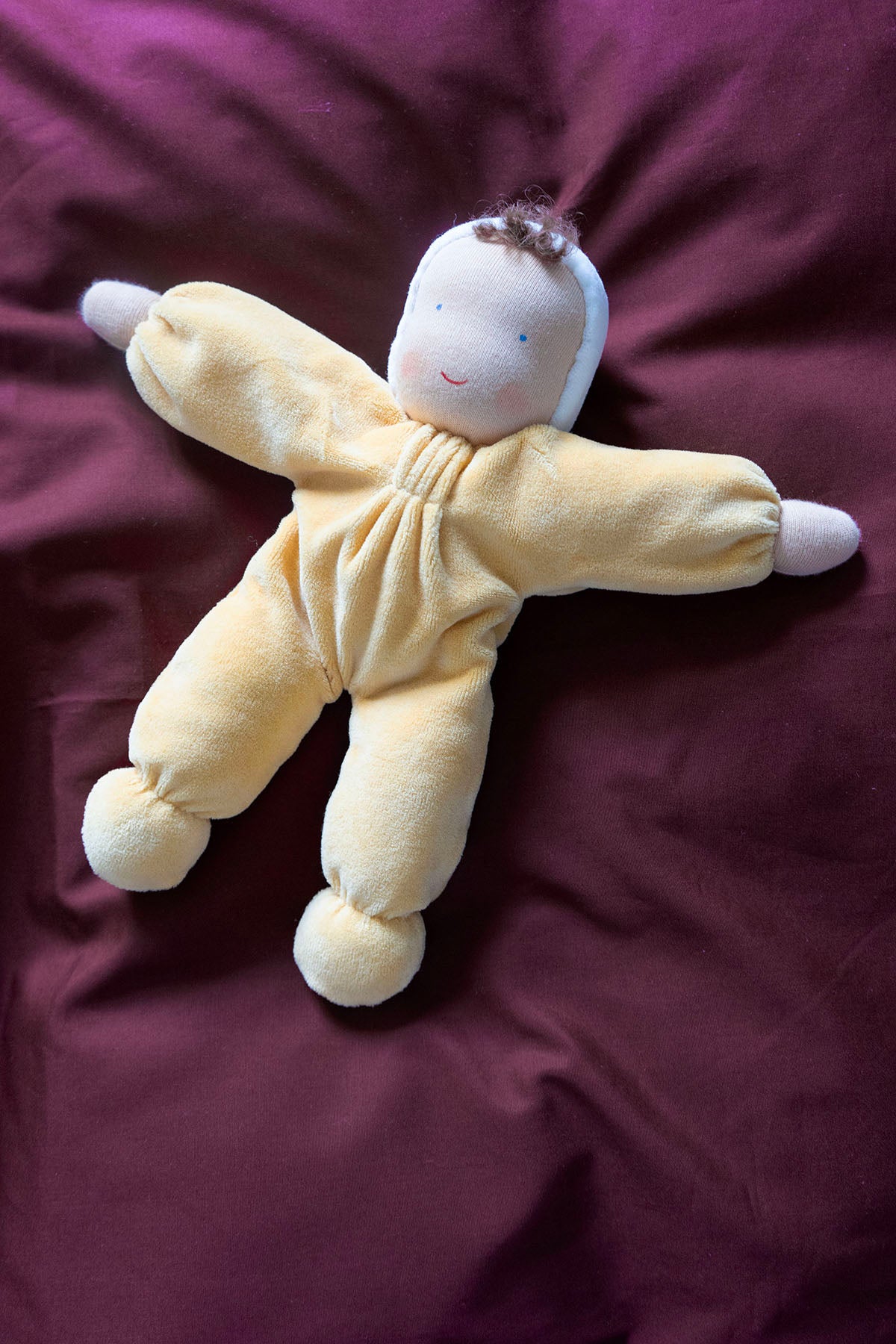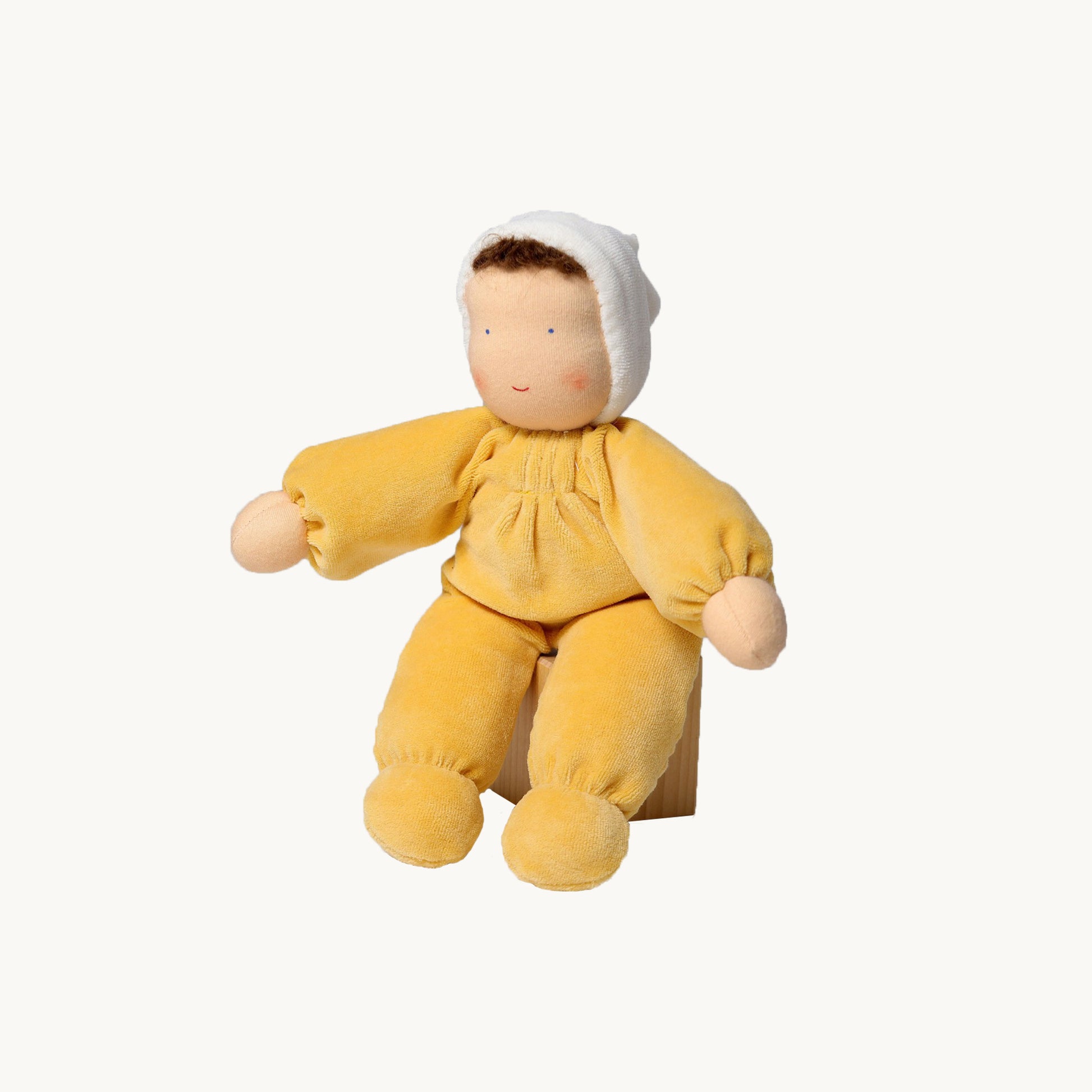 En blød og sød dukke i solgul velour, perfekt til at kramme ved sengetid. Dukken er fremstillet i Europa efter traditionelle håndværksteknikker, og hvert ansigt males i hånden, så ingen dukker er helt ens.