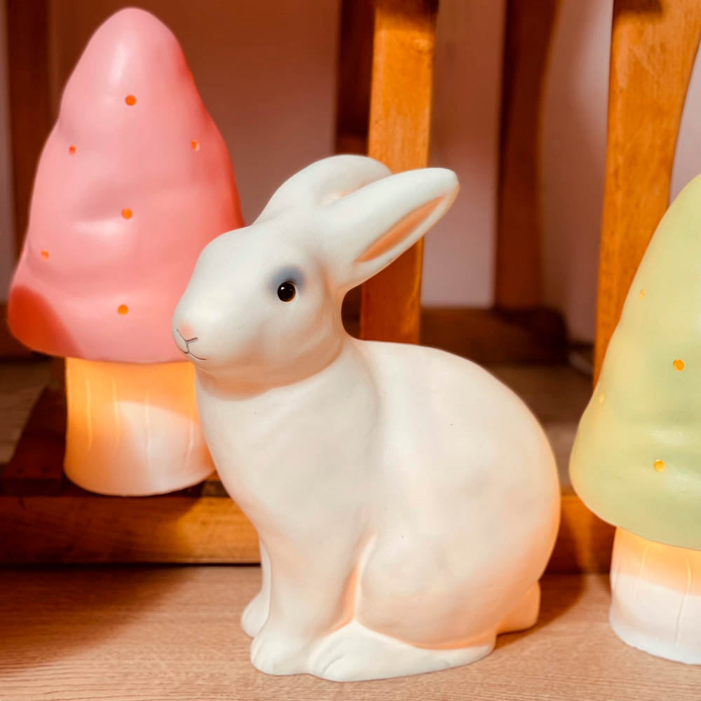 Den mest nyttede og eventyrlige hvide kanin som natlampe. Denne kanin giver et hyggeligt lys på børneværelset og hjælper trygt børnene med at falde i søvn om aftenen.
