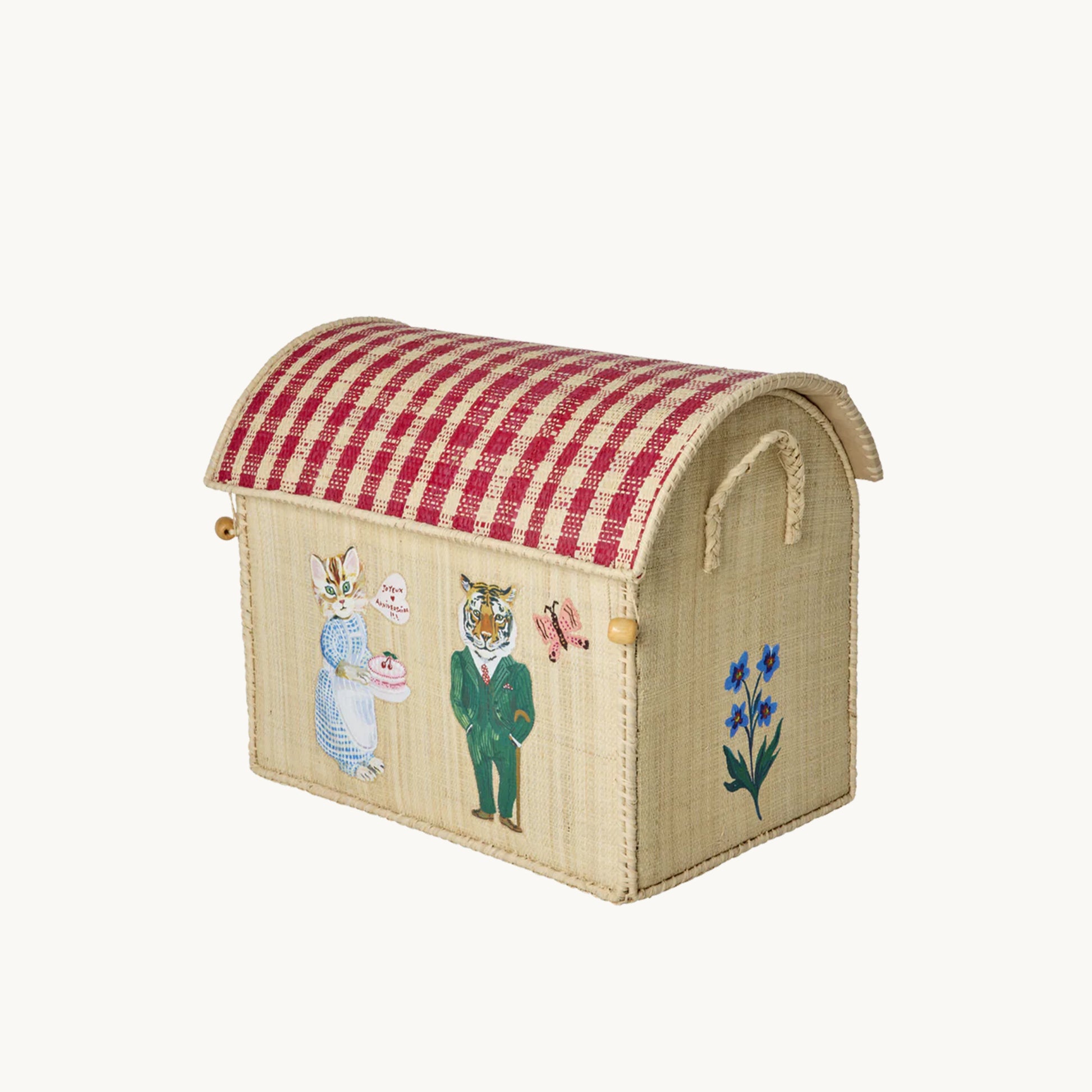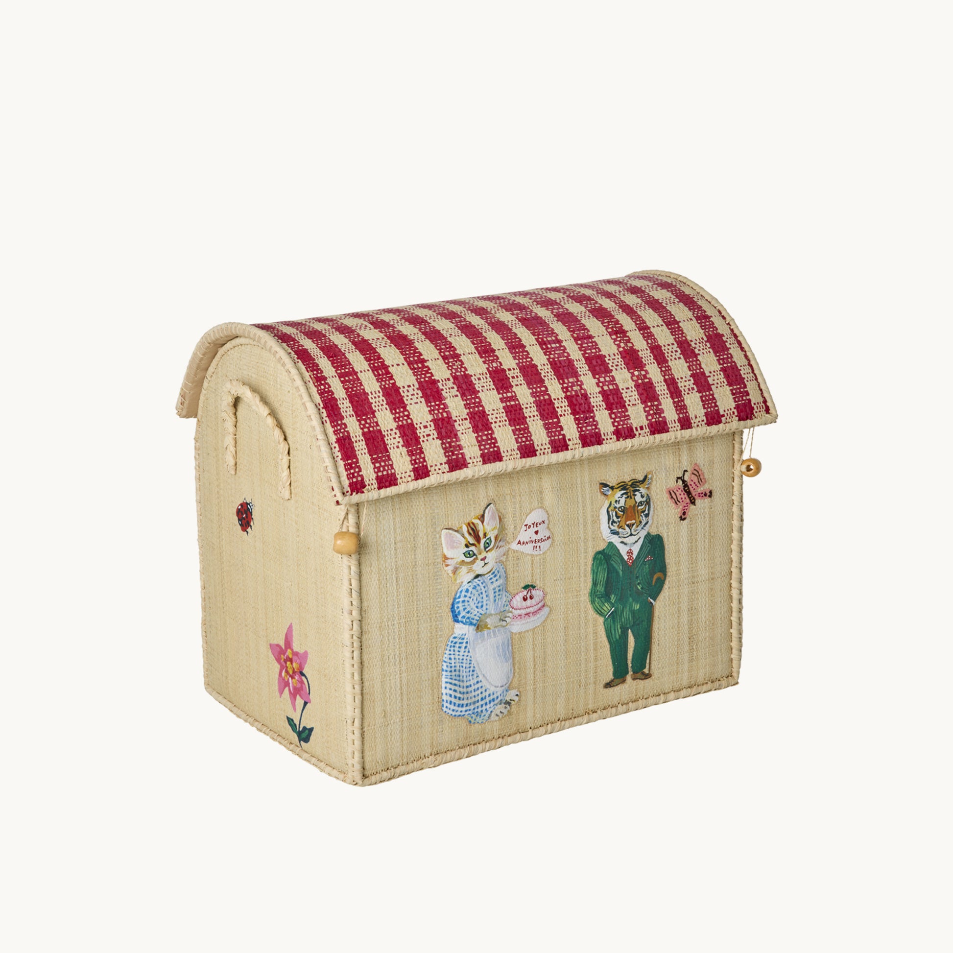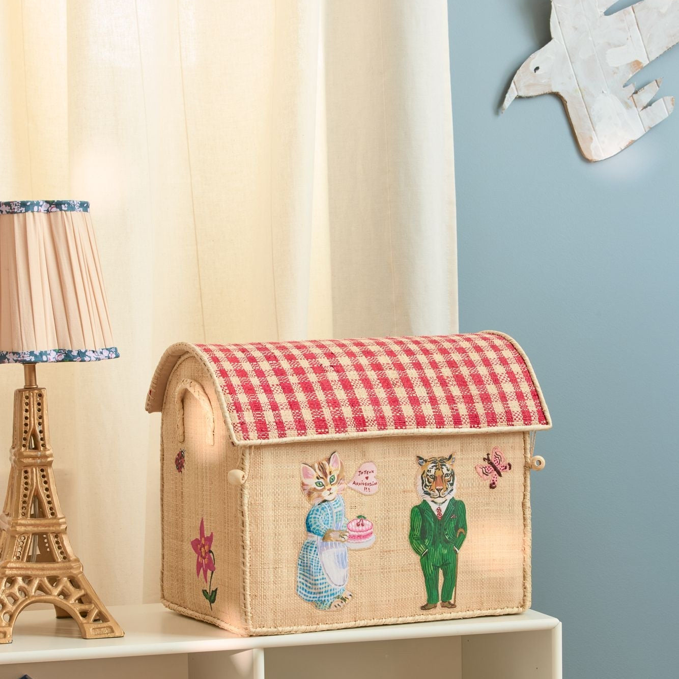 Et sandt drømmesamarbejde: RICE x Nathalie Lété. Vi deler en kærlighed til det fantasifulde, finurlige og farverige – og nogle gange lidt barnlige... som dette charmerende lille opbevaringshus i håndflettet raffia. Med en stilet tiger på den ene side og en kageglad kat på den anden, bliver opbevaring en del af legen.