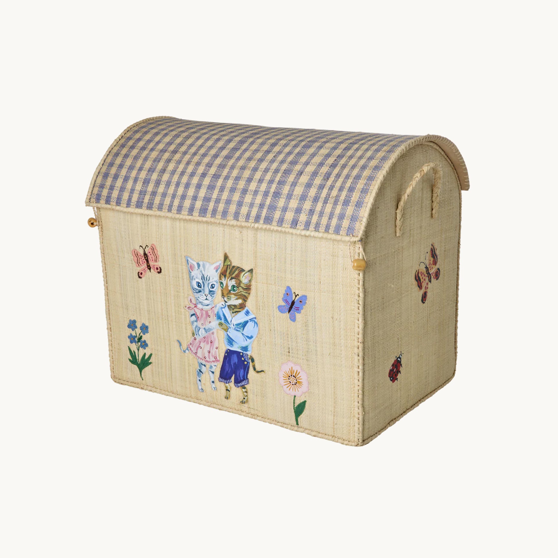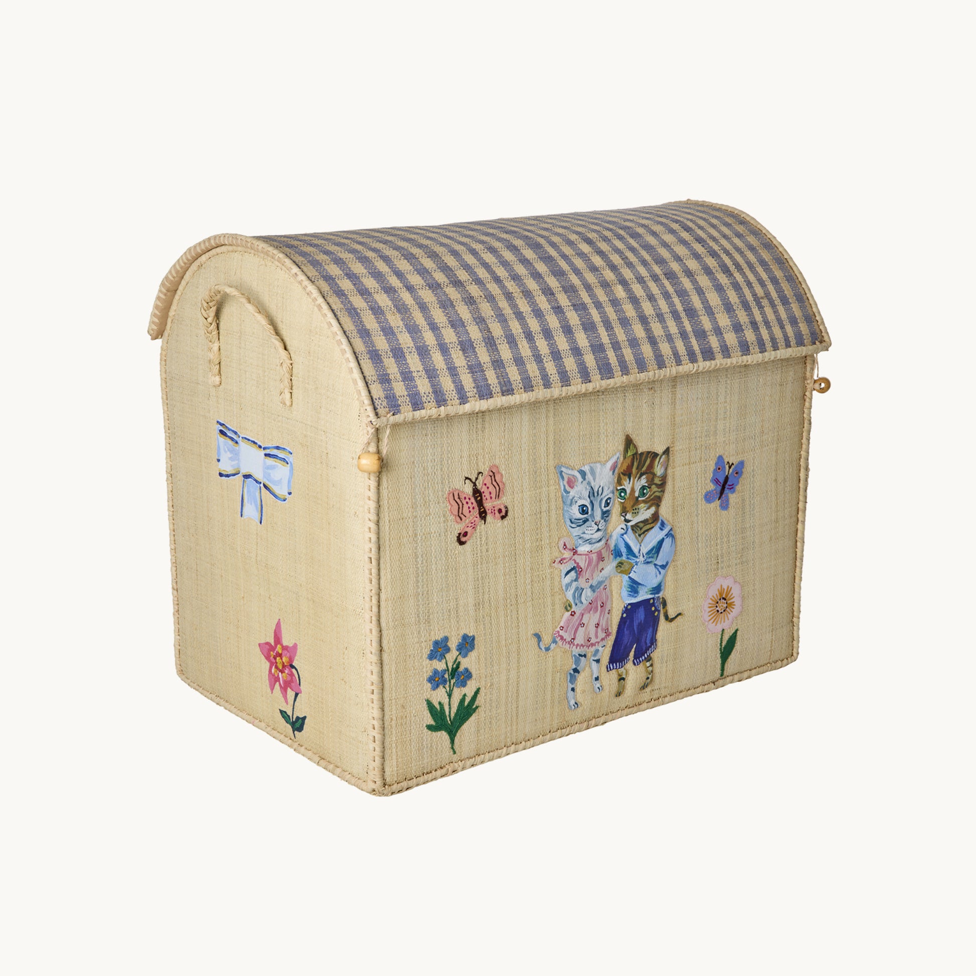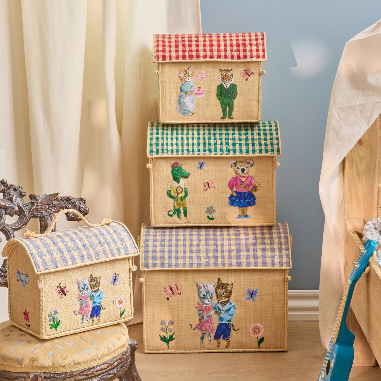 Et sandt drømmesamarbejde: RICE x Nathalie Lété. Vi deler en kærlighed til det fantasifulde, finurlige og farverige – og nogle gange lidt barnlige... som dette charmerende lille opbevaringshus i håndflettet raffia. Med en stilet tiger på den ene side og en kageglad kat på den anden, bliver opbevaring en del af legen.