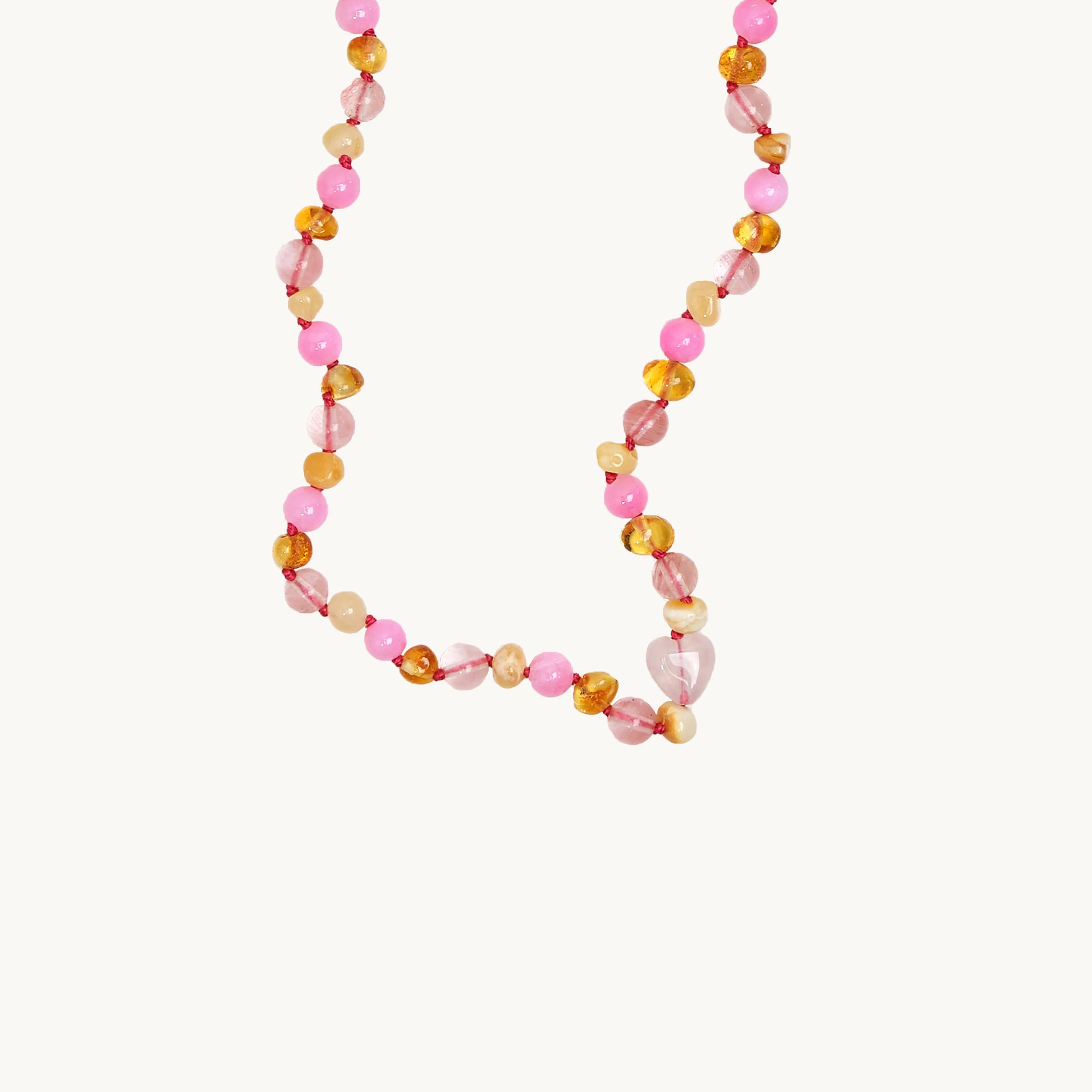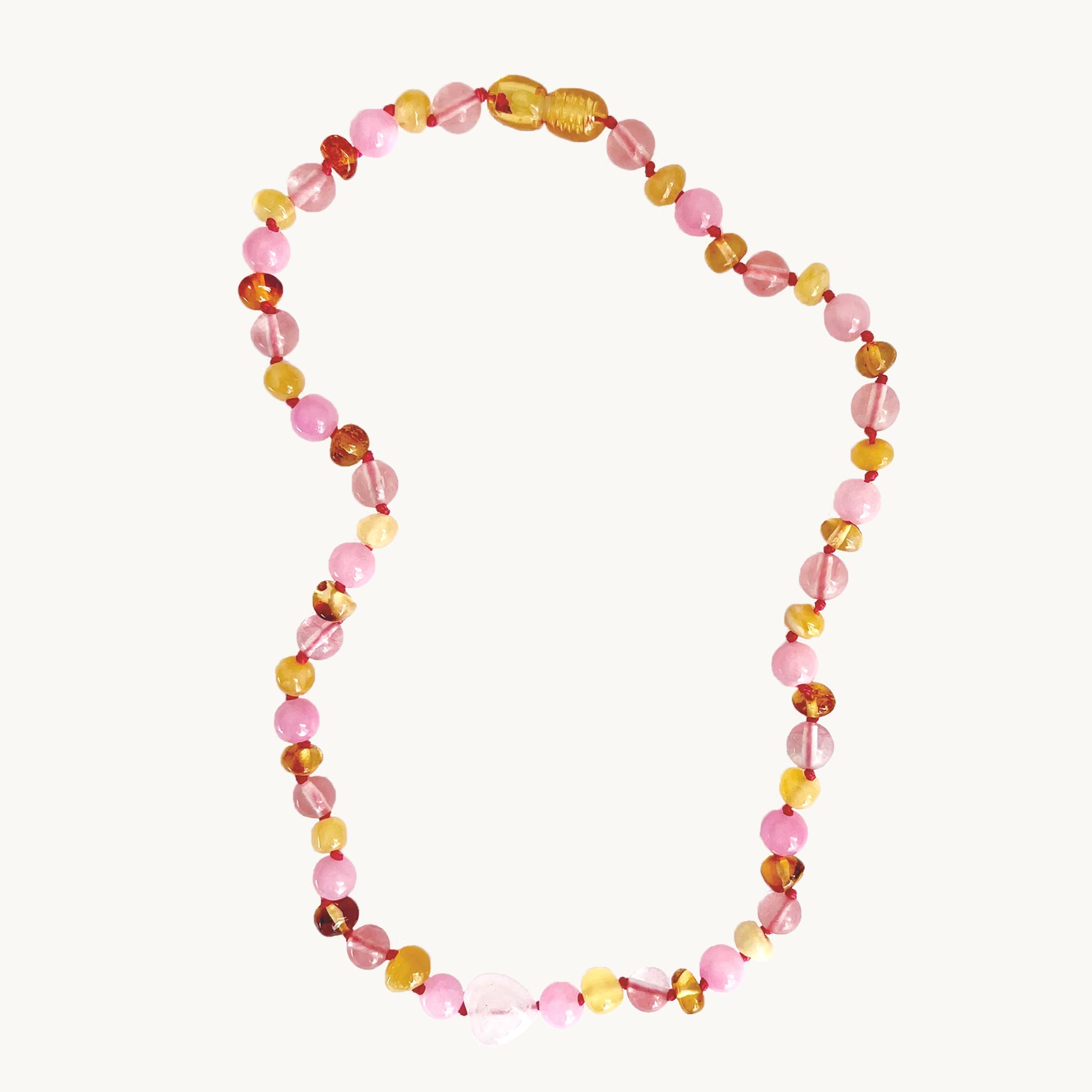 Perler af Rosa jade, kirsebærkvarts, mælkerav, honningrav, rosenkvarts (plus sikkerhedslås)
