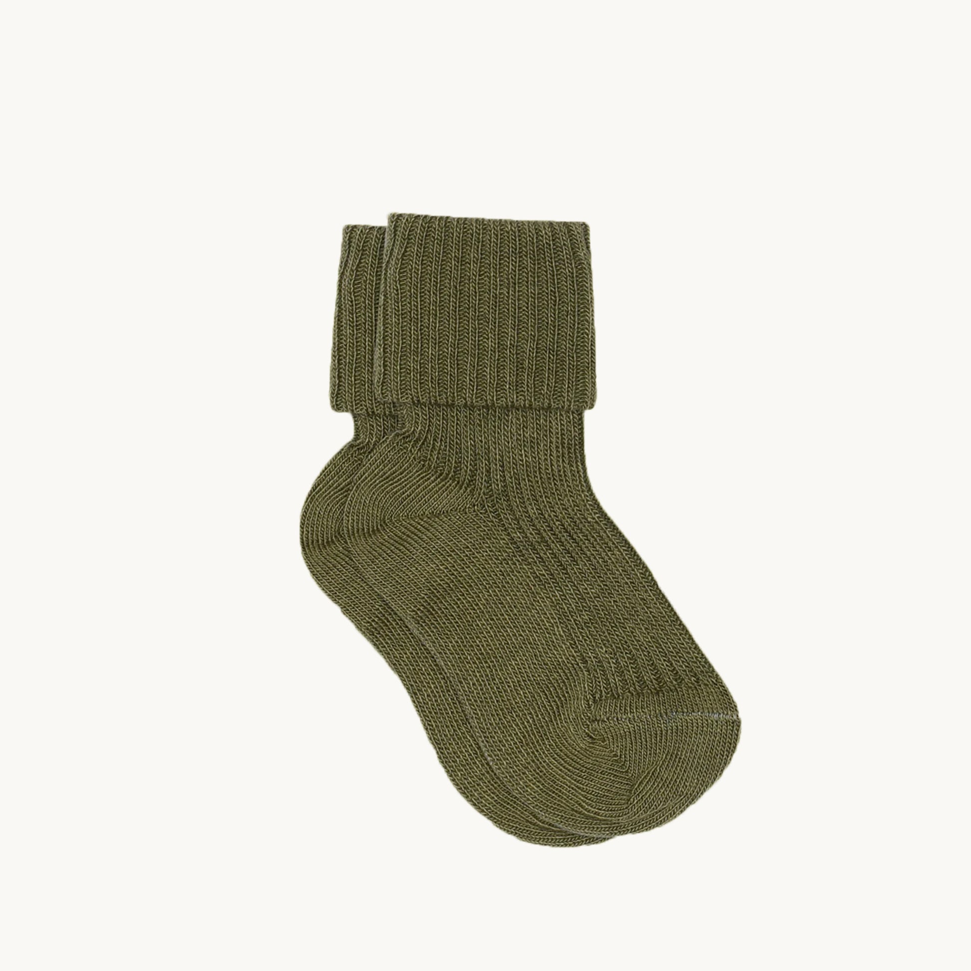 Bløde ribstrømper i bomuld til baby, designet med fold-over kant og anatomisk hæl for en naturlig pasform. Den elastiske rib gør, at strømperne bliver siddende hele dagen uden at stramme.