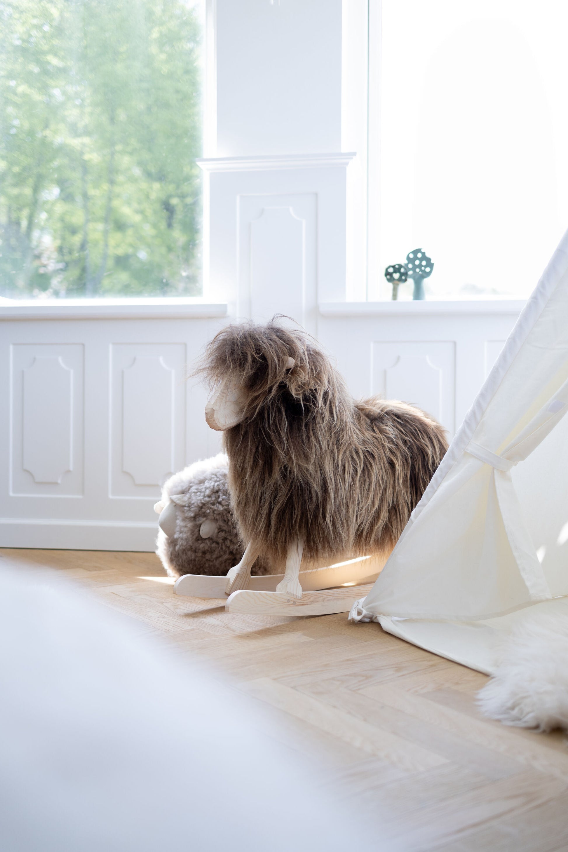 Et smukt, vuggende får, der inviterer til både leg og ro. Fåret er bygget på en solid ramme af FSC-certificeret fyrretræ og beklædt med blødt fåreskind/uld, som giver et varmt, levende udtryk.