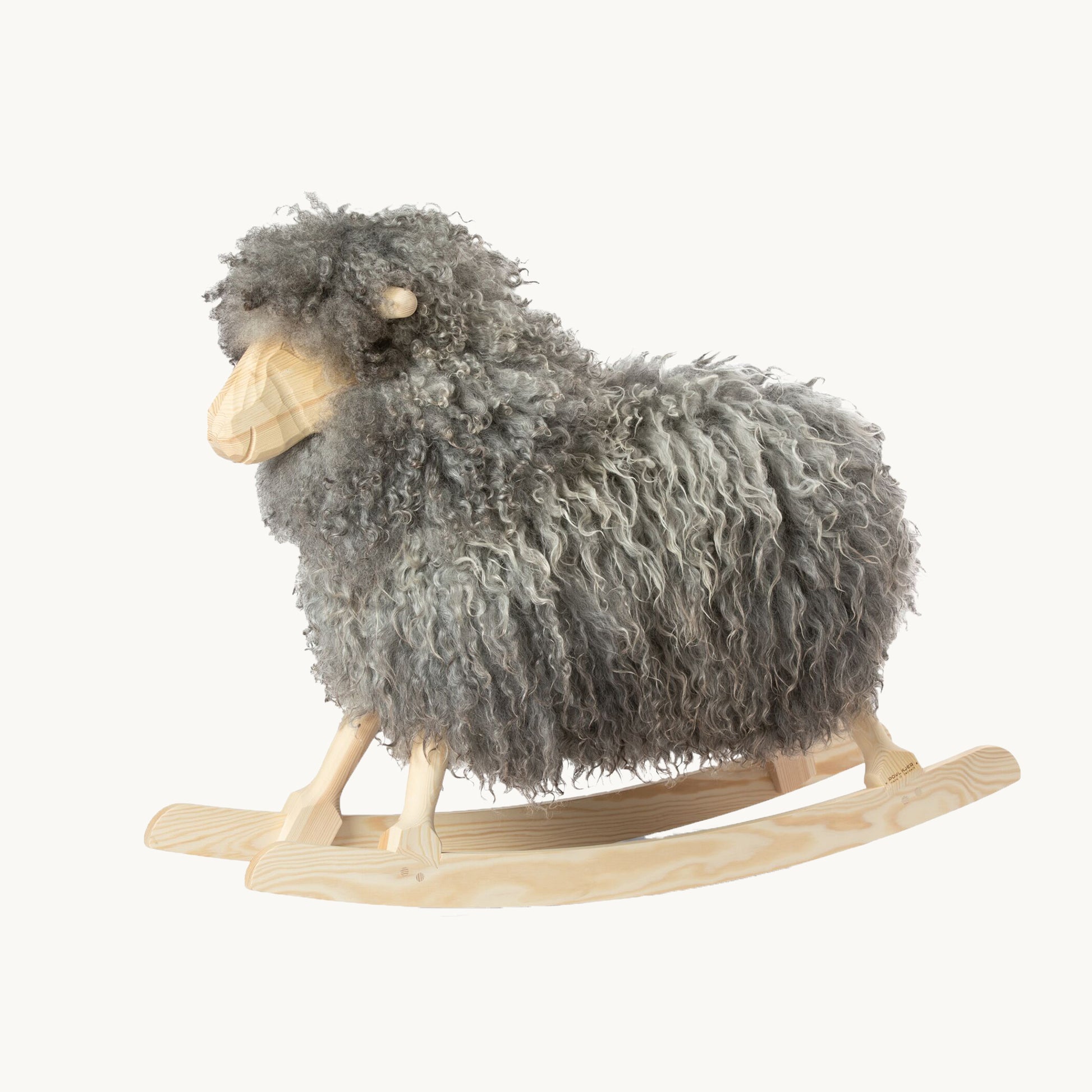Et smukt, vuggende får, der inviterer til både leg og ro. Fåret er bygget på en solid ramme af FSC-certificeret fyrretræ og beklædt med blød Gotland uld, som giver en naturlig grå tone og et varmt, levende udtryk.