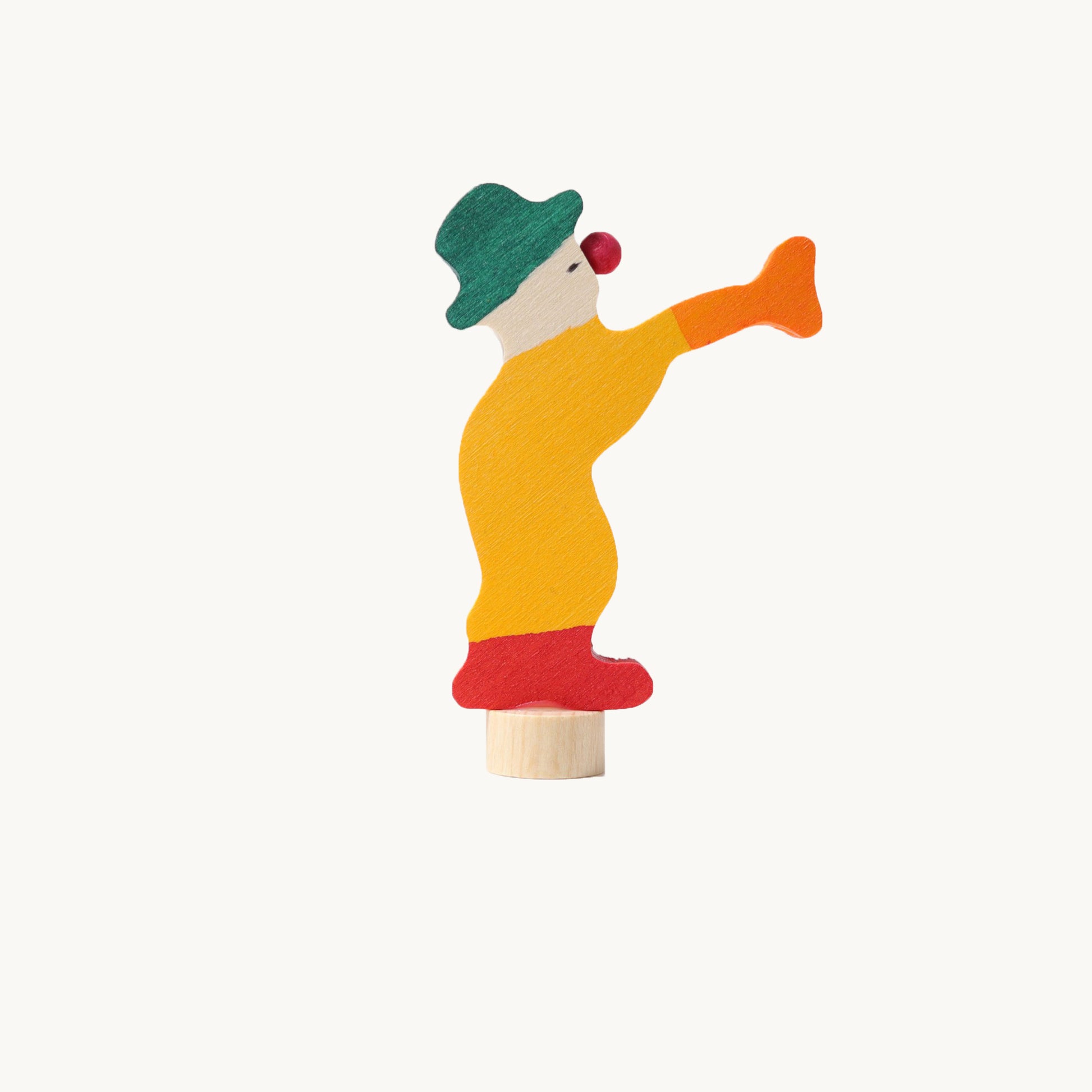 Figuren er skåret i lime-træ og omhyggeligt malet med en vandbaseret, ikke-giftig farve – så træets naturlige åre fortsat viser sin varme og levende struktur. Med en højde på ca. 7 cm er klovnen markeret, men stadig let nok til at blande sig harmonisk med både tal, lys og andre små figurer.
