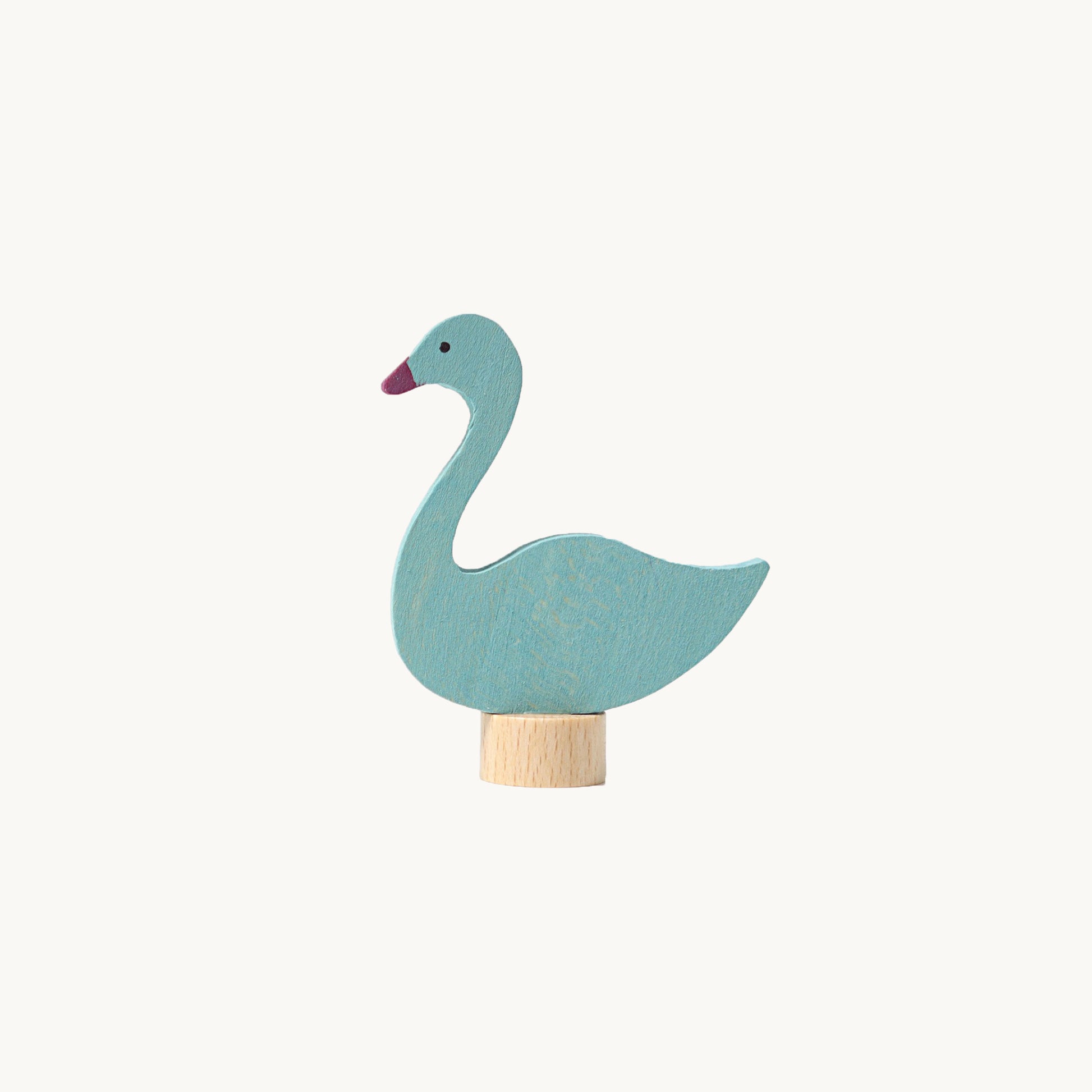 Svanefiguren er håndskåret i lindetræ og malet med giftfri, vandbaseret farve, så hver lille nuance og åre i træet skinner igennem. Med sin langstrakte hals og bløde former tilføjer den dialog og bevægelse til en ellers stille helhed.