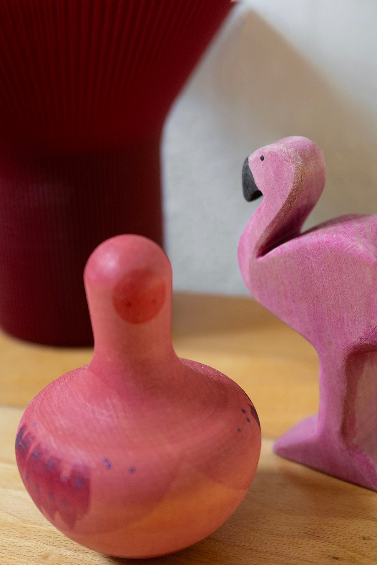 En lille træfugl, perfekt afbalanceret og klar til at snurre, rulle og bringe glæde til små hænder. Den er håndmalet i blide rosa nuancer, som giver et roligt og harmonisk udtryk, samtidig med at den inviterer til leg og sanselig udforskning.