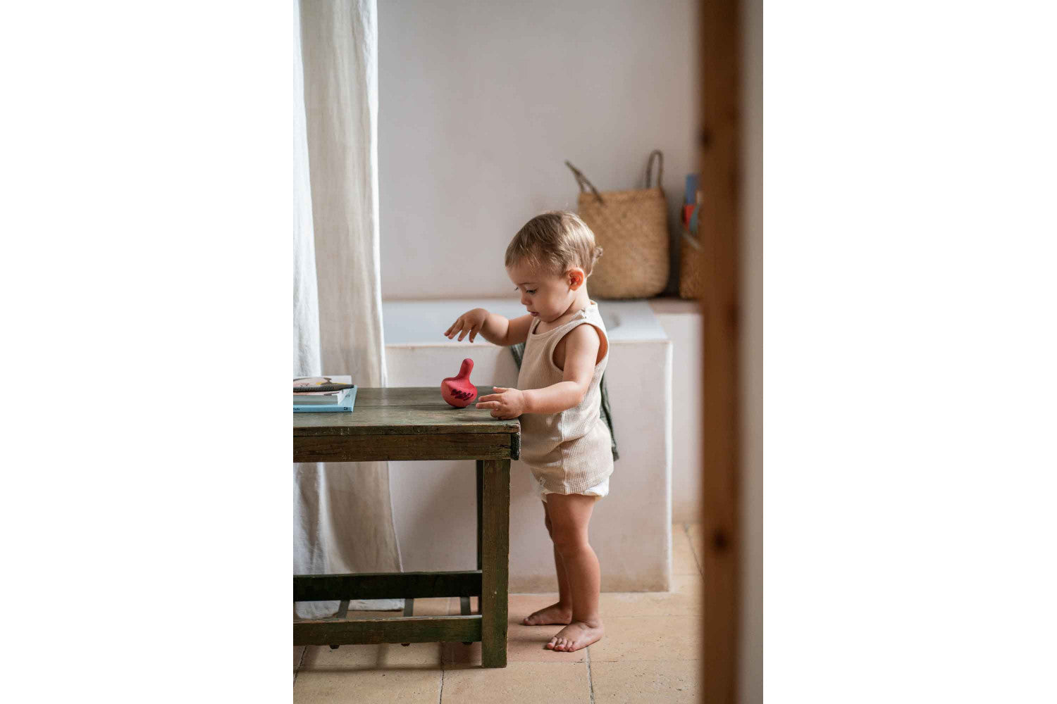 Med sine afrundede former kan fuglen vippe og bevæge sig i rolige rytmer, hvilket giver barnet en oplevelse af balance og bevægelse. Den er lavet af bæredygtigt træ og behandlet med giftfri, vandbaseret farve og olie, så den både er sikker og holdbar.